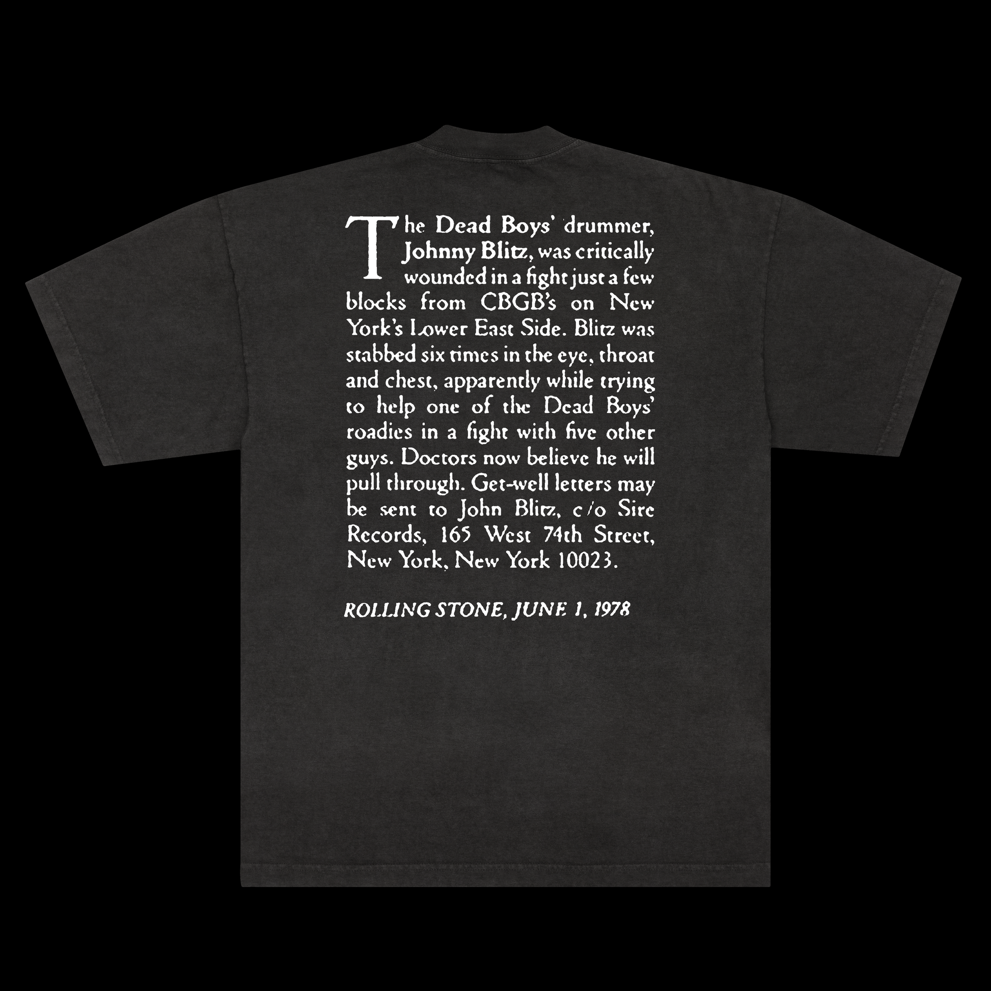 The Blitz Benefit was everything that was best in the CBGB scene: it was wild, unpredictable and small-town in its own peculiar way. We remember Cheetah Chrome as MC, taking on a leadership role… he was the glue that held those nights together. And who could forget Kathy Kurls, friend of the band, who stripped to “Sonic Reducer” right down to her pasties. Among so many others, Syl Sylvain and Arthur Kane, formerly of the New York Dolls, performed with their bands, the Criminals and the Corpse Grinders. Jeff Magnum, Dead Boys bassist, recalled using different drummers every night to fill in for Johnny. “It was cool to play with [ex-Doll] Jerry Nolan – he was a great drummer and Belushi was a lot of fun. To the tons of our friends who played for the benefit, we are eternally grateful.”